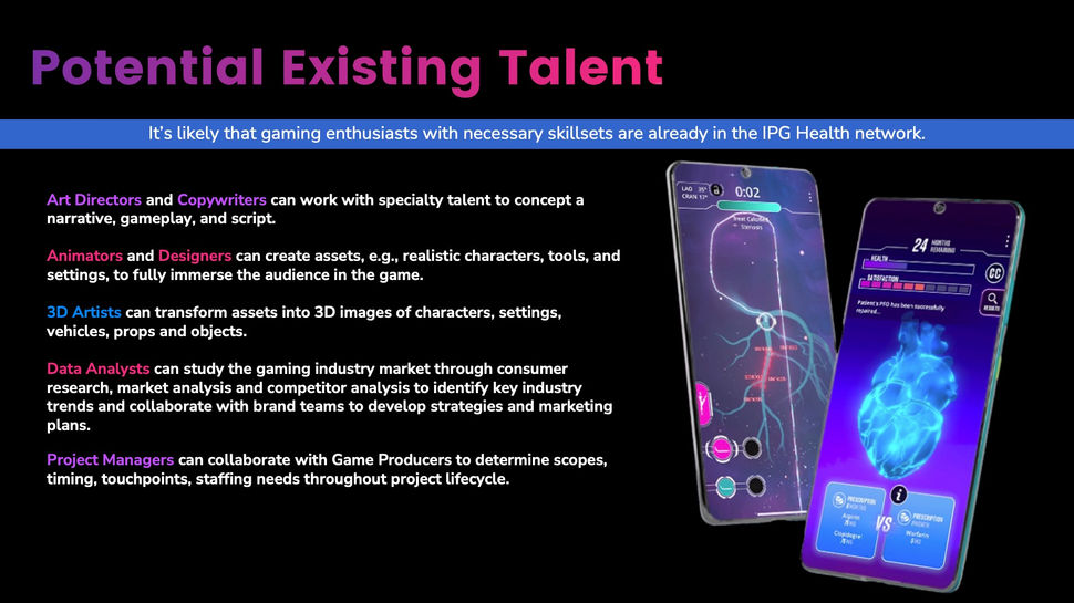 After superlative feecback from a previous presentation, this report was crafted after a conversation with the Chief Creative Officer of FCB Health. Using brand colors and fonts, we went to work to research case studies and find graphics that the CCO could use to get her team excited about a potential new discipline within the department. Design and copy by Kristine England. Made with PowerPoint.